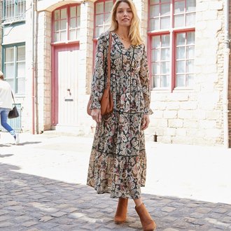 Dlouhé volánové šaty s potiskem, krepón