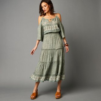 Dlouhé šaty s volánovým výstřihem