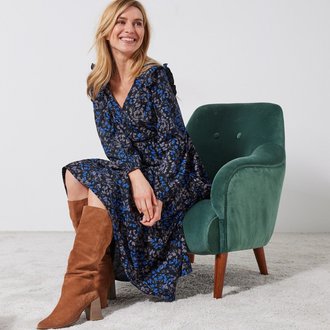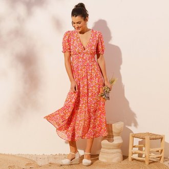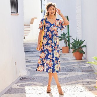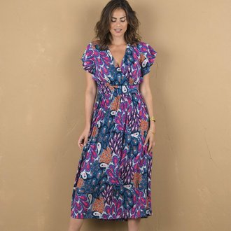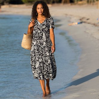 Kreponové midi šaty s překříženým výstřihem a potiskem