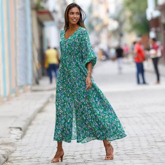Dlouhé voálové šaty s potiskem, pro menší postavu