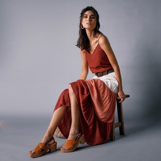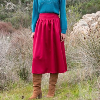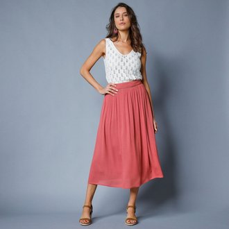 Jednobarevná midi sukně s rozparkem a žabičkovaným pasem