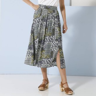Midi sukně s rozparkem, žabičkovaným pasem a potiskem