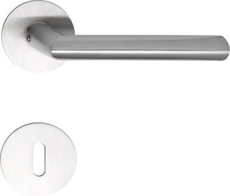 Solid stainless steel door handles with Glasgow rosette, round ob type.
